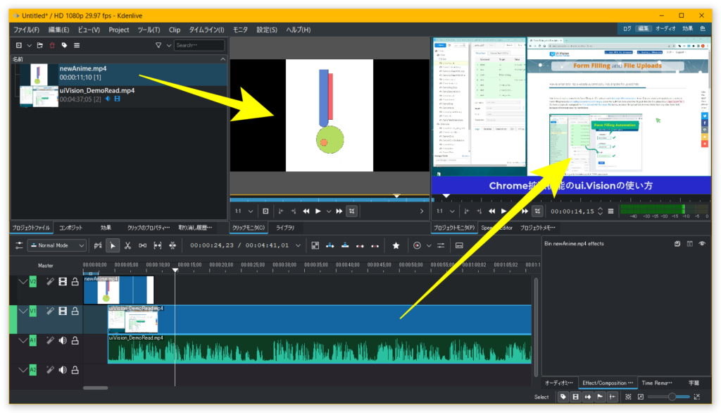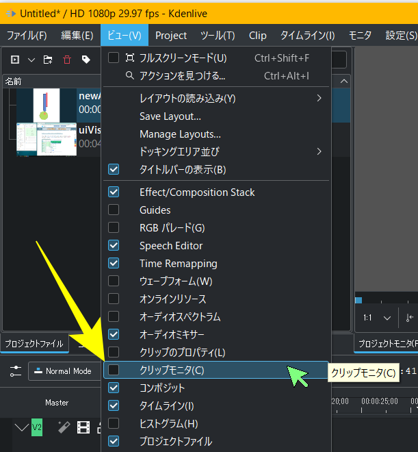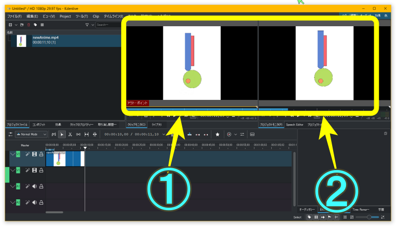 左(Clip Monitor)が素材の動画が表示される。加工されてないもの